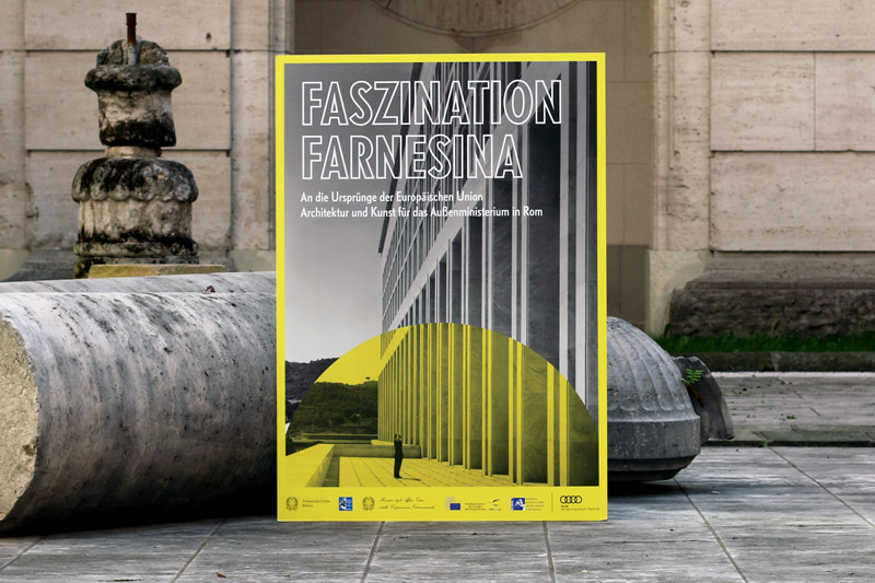 The Italian embassy in Berlin asked me to develop some posters and invitations for the exhibition Faszination Farnesina showing some artworks, plans and sketches connected to the Farnesina Building in Rome. With the goal of creating something minimal, I worked with an image shift. Ultimately it gives the effect of a lens and a focus on the building.