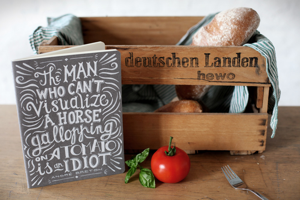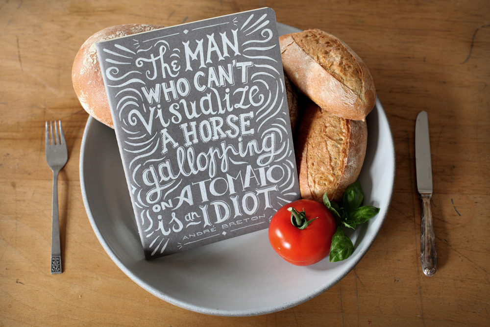 When Moleskine launched the grey cahier notebook, they called on several illustrators and designers to come up with a drawing or a graphic to promote the product online. The texture of the cover stood out to me, and so I gave it importance by keeping a subdued color scheme and developing a handwritten text with white pen. The quote, one of my personal favorites, is by surrealist Andre Breton. Photographs of the results were posted on Moleskine’s website and reposted on several other international blogs.