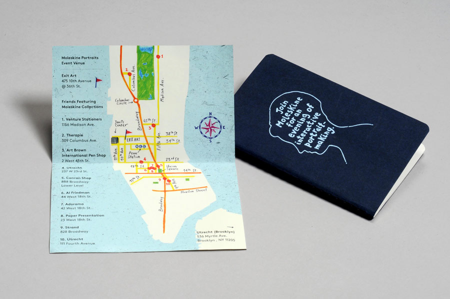 The central theme is the portrait and the act of describing ourselves through the places we visit, the images we share, the objects we cling to, the marks we leave behind, the tastes we savor. I was asked to design the promotional materials for this event. To communicate this new concept of the portrait as a quantity of experiences and daily life events, I conceptualized a poster reminiscent of a classical portrait, but with a face composed of different drawings, typographies, images. I had also to realize a small gift invitation sent to VIP, so I converted the face of the portrait in the invitation and included a hand-drawn map of Manhattan for directions to the venue.